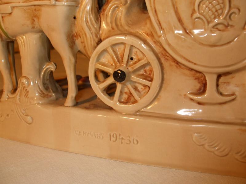 Keramikfigur mit einem Trio vor einem Kutschgespann. Bei der Inspektion der Figur konnten wir lediglich einen minimalen Chip an dem linken Ohr des einen Pferdes feststellen, der jedoch völlig unauffällig ist.