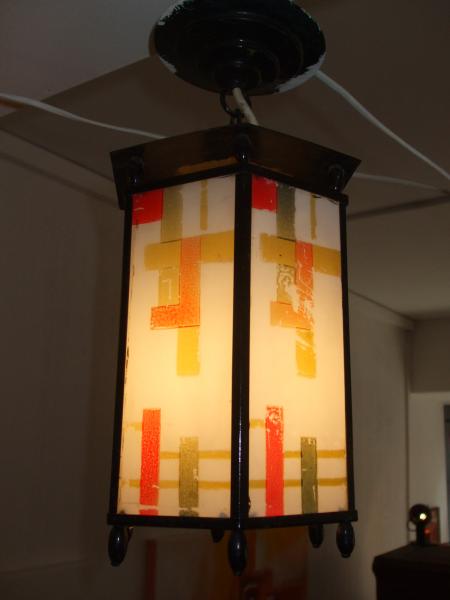 Zwanziger Jahre Deckenlampe. Die Bemalung der Lampe ist etwas berieben. Mit der Aufhängung ist die Lampe im Stil einer Laterne nur 35cm tief.