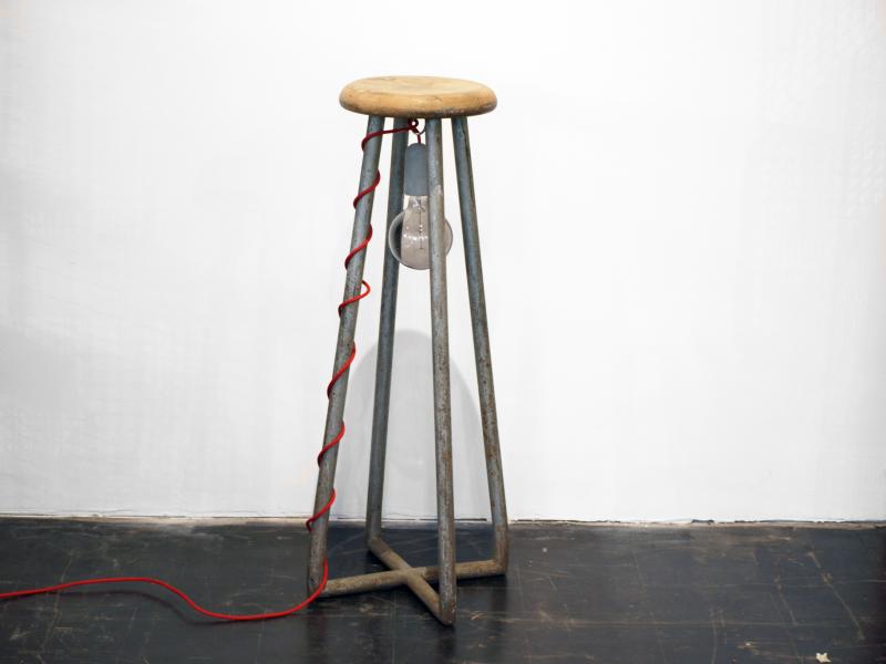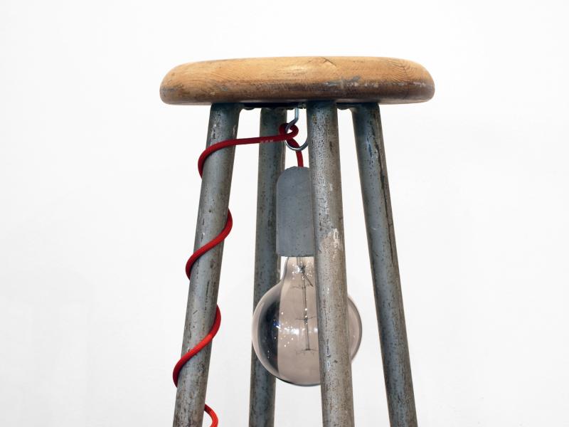 Originelle Stehleuchte aus einem ehemaligem Webhocker und einer Textilkabellampe mit rotem Kabel und Betonfassung. Das Licht spendet eine 60Watt Glühbirne von Frama mit einem Durchmesser von 125mm und rauchgrau gefärbtem Glas.