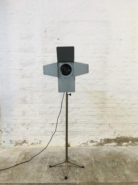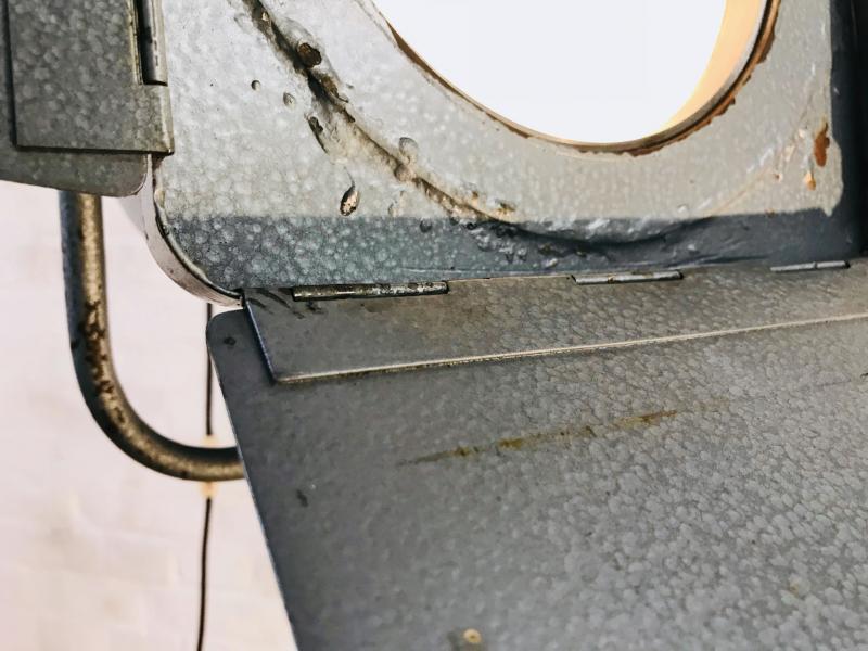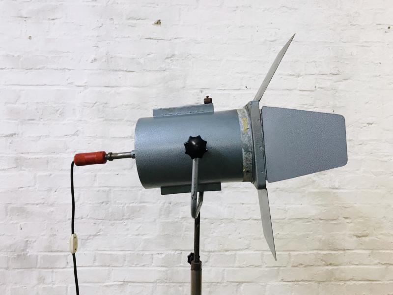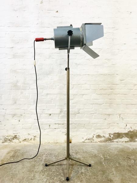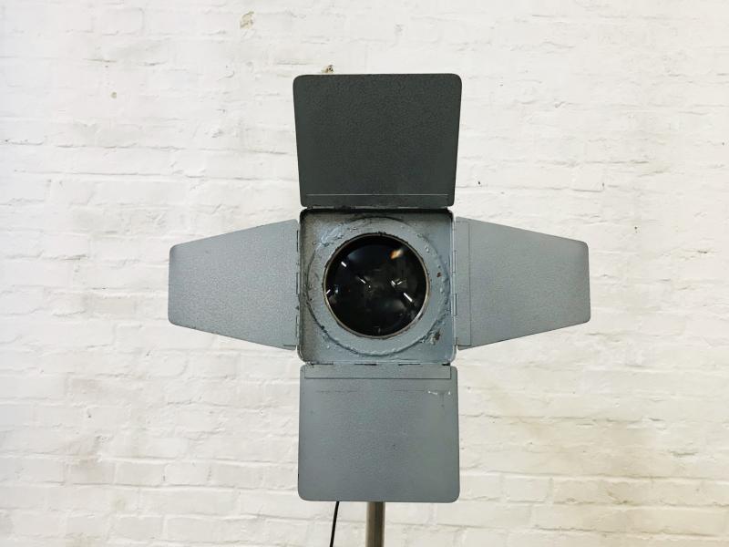 Alter Strahler im Originalzustand auf Vierbeinstativ. Der Strahler hat vier Klappen zur Lichtregulierung und befindet sich im Originalzustand mit Hammerschlaglack.