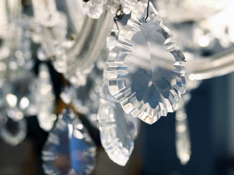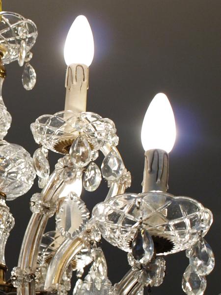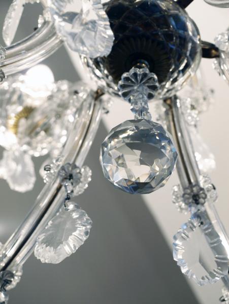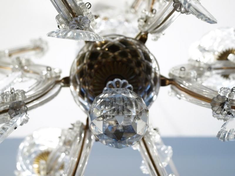 Zweietagiger, 9flammiger Kristall Lüster mit klarem Glasbehang. Die Lüsterschalen wie die Baluster sind ebenfalls aus Glas, sehr gepflegt und in sehr gutem Zustand.