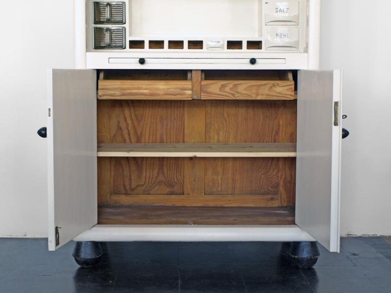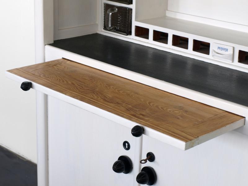 Es wurde vom Tischler frisch aufgearbeitet und gestrichen, die fehlenden Schütten werden möglichst passend ersetzt.