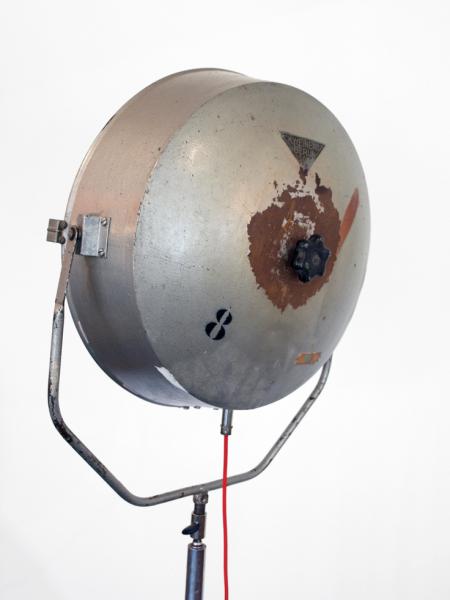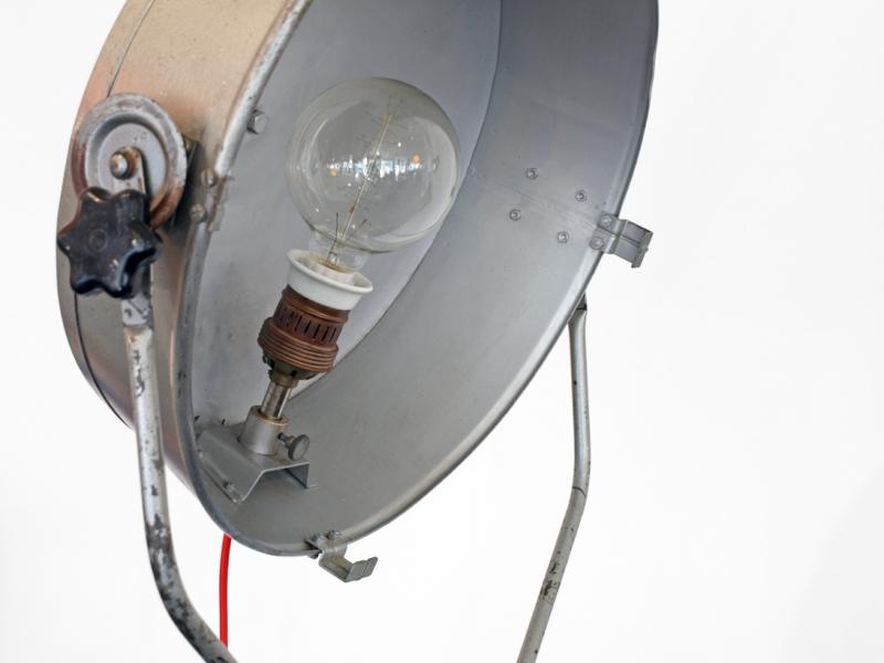 Von uns für den Hausgebrauch umgebauter alter Strahler auf rollbarem Dreibeinstativ, wie man ihn von Film und Fotografie kennt. Mit Textilkabel in Wunschfarbe.